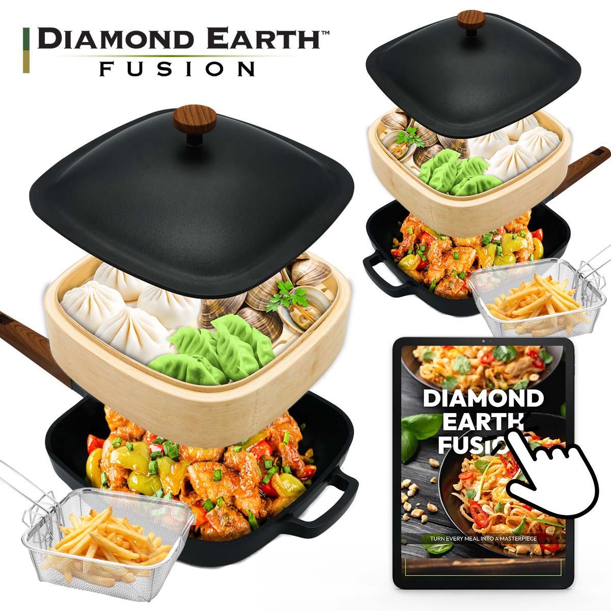 Includes a deep fry basket for crunchy chicken and donuts, and a bamboo steamer to create authentic Asian flavors.